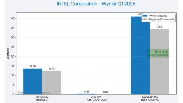 Kolejna ze spółek, ASML, mimo wcześniejszych obaw opublikowała raport o silnych zamówieniach na systemy litograficzne, potwierdzającym samym, że producenci chipów zbroją się na potęgę. To pokazuje, że nie jesteśmy w fazie obietnic, ale w fazie realnych miliardowych wydatków na fizyczny sprzęt, związany z infrastrukturą AI. Przejdźmy do konkretów z tego tygodnia. Intel publikował już swoje wyniki finansowe. Kluczowym elementem był outlook, czyli prognozy na przyszłość, które były pozytywne.