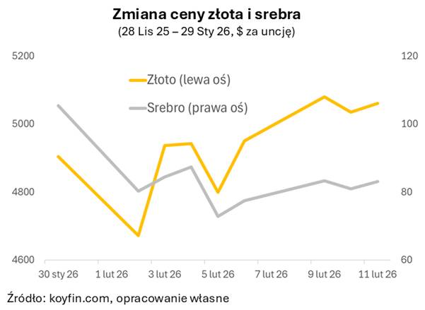 Srebro pomimo tego, że pojawiły się nawet prognozy mówiące, że w krótkim terminie cena srebra może wzrosnąć nawet do 150 dolarów za uncję jest to na ten moment bardzo mało prawdopodobne paradoksalnie kilka dni po ujawnieniu tej prognozy przez jeden z amerykańskich banków inwestycyjnych miał miejsce dynamiczny spadek cen srebra z 180 dolarów za uncję. Czy 150 dolarów za uncję srebra jest możliwe? Oczywiście tak. Czy jest prawdopodobne? Raczej nie. Prognoza analityków z Wall Street bazowała na historycznej relacji złota i srebro odwołując się m.in. do poziomów sprzed kilkunastu czy nawet kilkudziesięciu lat, więc dla mnie była totalną abstrakcją. W dłuższej perspektywie, oddając trochę profesjonalizmu, twórcom tej prognozy, zakładali oni, że cena srebra z ówczesnych poziomów 110-120 dolarów za uncję spadnie w drugiej połowie roku do poziomu 80 czy nawet 70 dolarów za uncję. Rzeczywiście cena srebra na poziomie 70-80 dolarów za uncję, to jest poziom, który przejawia się w wielu prognozach, więc perspektywa dalszego wzrostu ceny srebra jest raczej wątpliwa, ponieważ obecnie wynosi ona około 80 dolarów. Prognozy mówią o stabilnym popycie na srebro w najbliższych latach, a nie jest towar, który nagle ze względu na jakieś złe warunki pogodowe, tak jak to chociażby dwa lata temu obserwowaliśmy na cenie kakao czy rok temu na cenie kawy, nagle okaże się bardzo deficytowy i jego podaż znacząco spadnie, więc silne wzrosty, które obserwowaliśmy w grudniu i styczniu z perspektywy relacji podaży i popytu nie były zbytnio uzasadnione. W dłuższej perspektywie nie ma to racji bytu i rzeczywiście ten poziom 70-80 dolarów, czy nawet niektóre bardziej konserwatywne prognozy mówią o spadku do poziomu 60 dolarów za uncję, wydaje się jak najbardziej racjonalny.